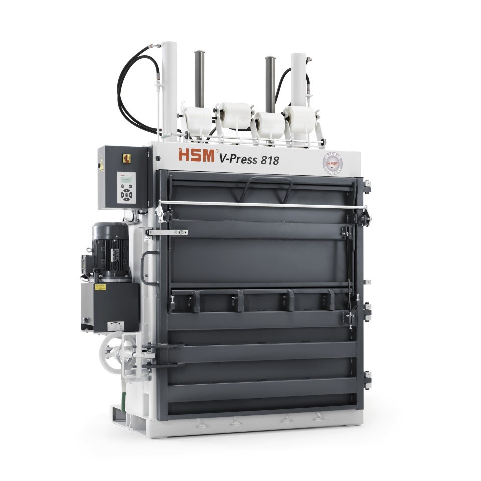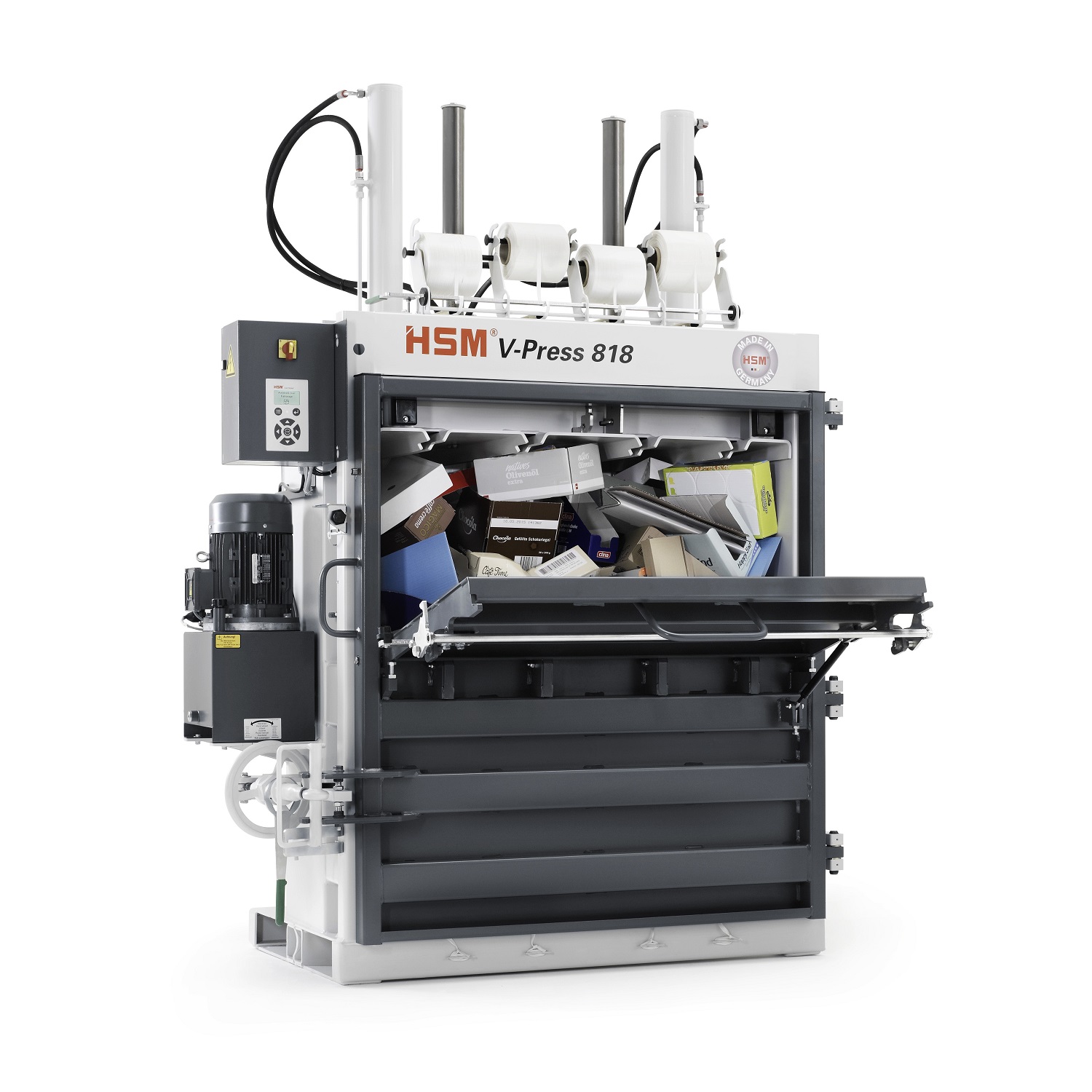 Výkonné zařízení dosahuje lisovací síly 185 kN. Je vhodný pro lisování zbytků děrování, smíšeného papíru, oděvů, fólií a kartonu. Vertikální paketovací lis V-Press 818 plus od HSM® ovládáte s membránovou klávesnicí a textovým displejem. Plnění v pohodlné výšce plnění 958 mm je velmi snadné díky odklopným dvířkům včetně plnicí klapky. Tyto dveře lze navíc rychle otevřít a zavřít ručním kolem.