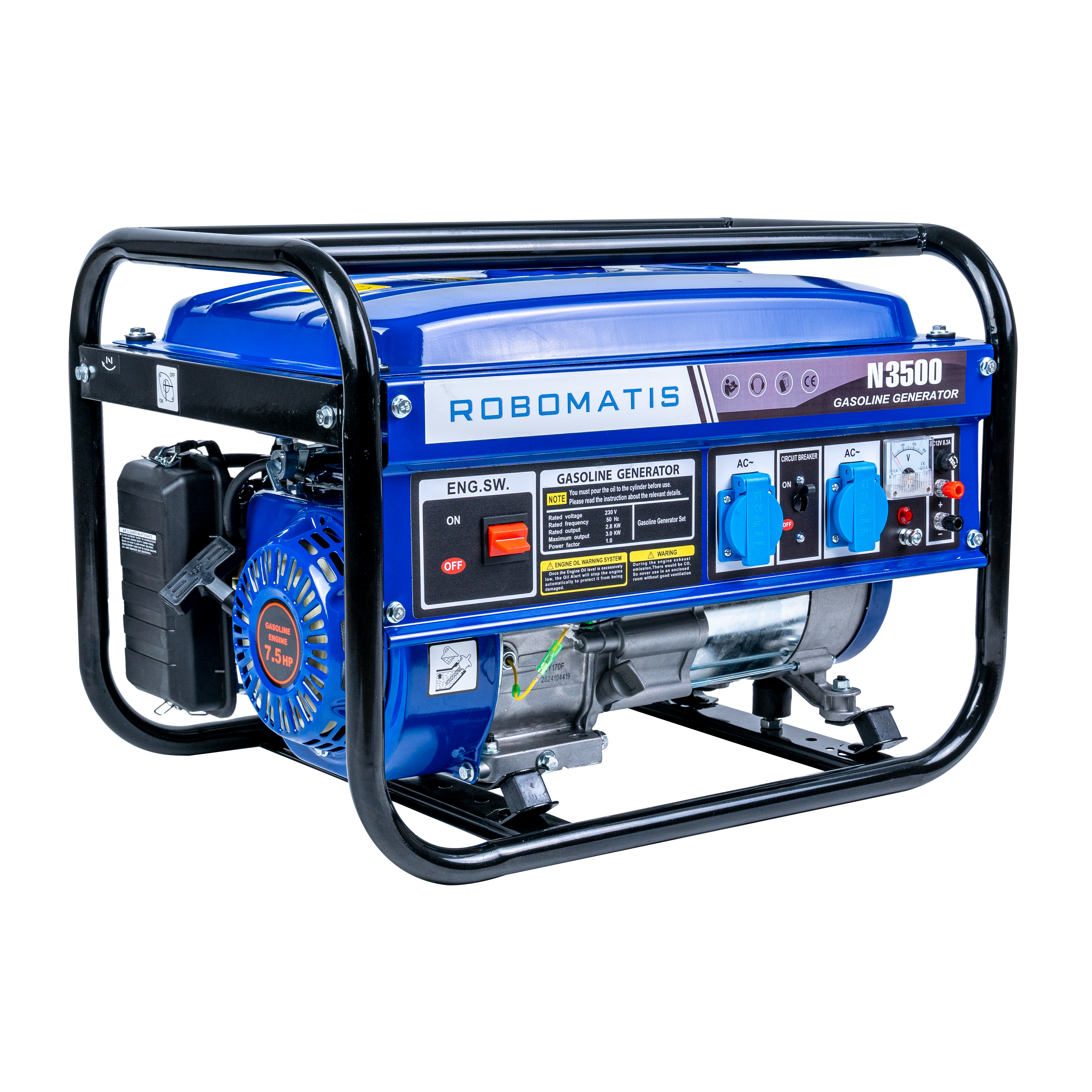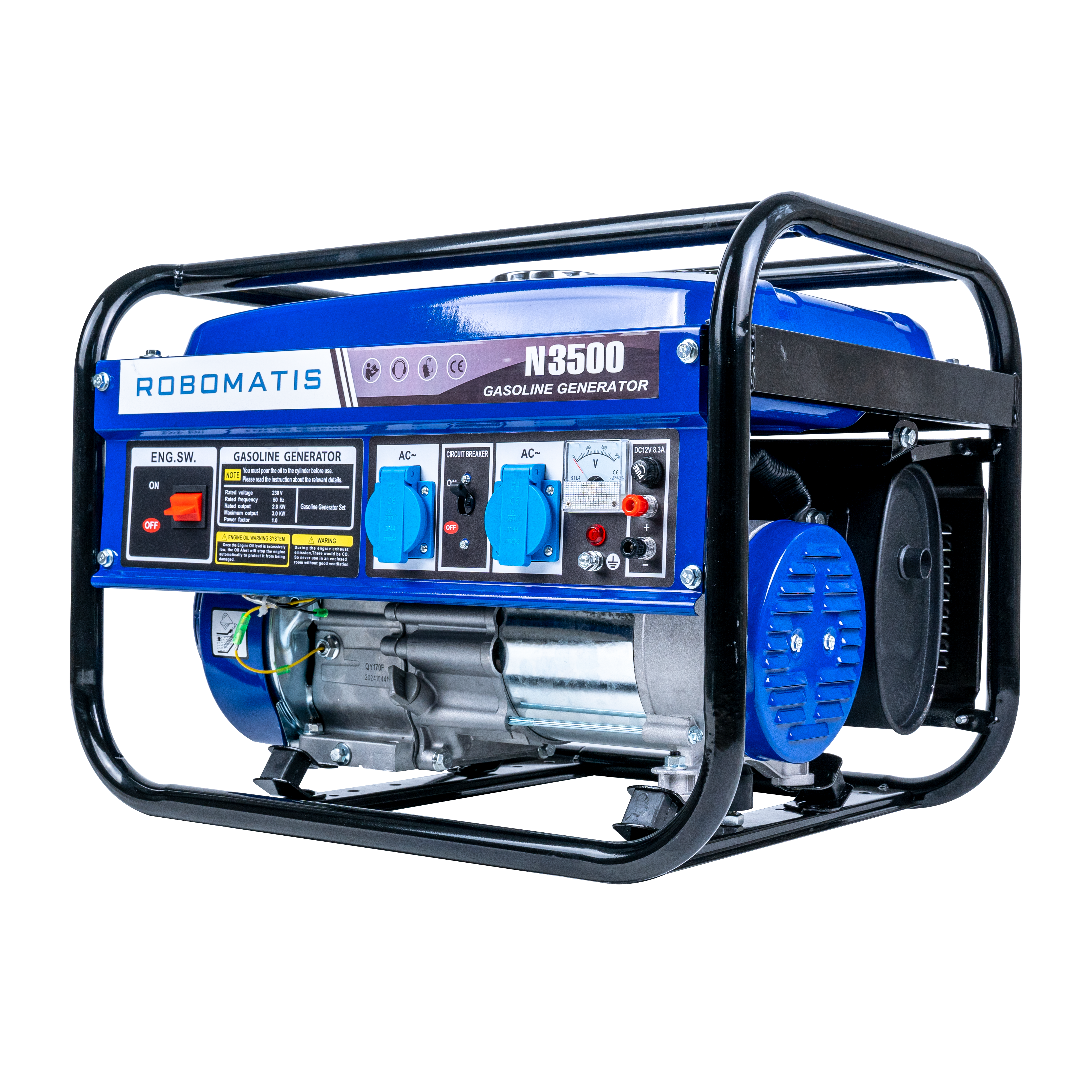 Elektrocentrála pracuje na frekvenci 50 Hz a poskytuje jednofázové střídavé napětí 230V. Je vybavena dvěma evropskými zásuvkami 230V (16A), což umožňuje současné připojení více elektrických zařízení. Alternátor je vyroben ze 100% mědi a je opatřen kartáčem a automatickým regulátorem napětí (AVR), který pomáhá udržovat stabilní výstupní napětí a chrání připojená zařízení před výkyvy napětí.